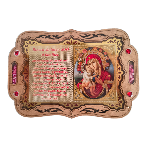 Această icoană decorativă redă rugăciunea „Binecuvântarea casei și a familiei” alături de chipul **Maica Domnului cu Iisus Hristos, într-o reprezentare caldă, tradițională, inspirată din iconografia bizantină.