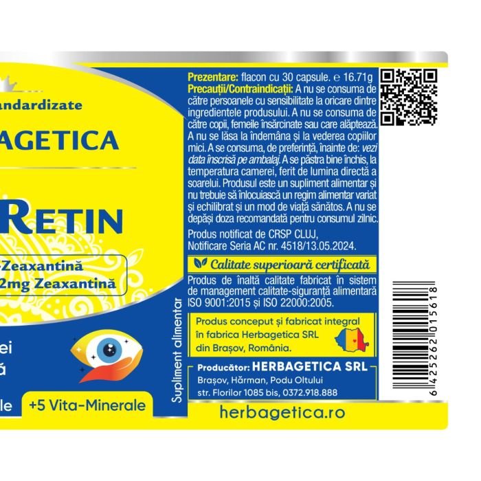 MacuRetin are în compoziția sa și 12 mg Luteină/capsulă și 2 mg Zeaxantină/capsulă, obținute din extractul de flor de Crăiță. Împreună, acești doi pigmenți maculari acționează ca un filtru pentru lumina albastră și radiațiile UV, oferind protecție pentru celulele fotoreceptoare ale ochiului. În plus, au și efect antioxidant intens. Luteina și Zeaxantina, contribuie în mod eficient la claritatea vederii, protecția ochiului și la întârzierea degradării avansate a vederii.