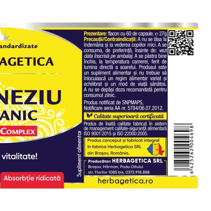 • anxietate, atacuri de panicăMagneziul Organic Herbagetica este potrivit pentru toate vârstele și poate fi utilizat pentru a preveni sau trata deficiențele de magneziu. Acest supliment poate fi folosit de către persoanele care au un nivel scăzut de magneziu, de către sportivi sau de către persoanele care urmează o dietă săracă în magneziu. Folosind Magneziu Organic Herbagetica, îți poți îmbunătăți sănătatea generală, reducând riscul de afecțiuni asociate cu deficitul de magneziu.